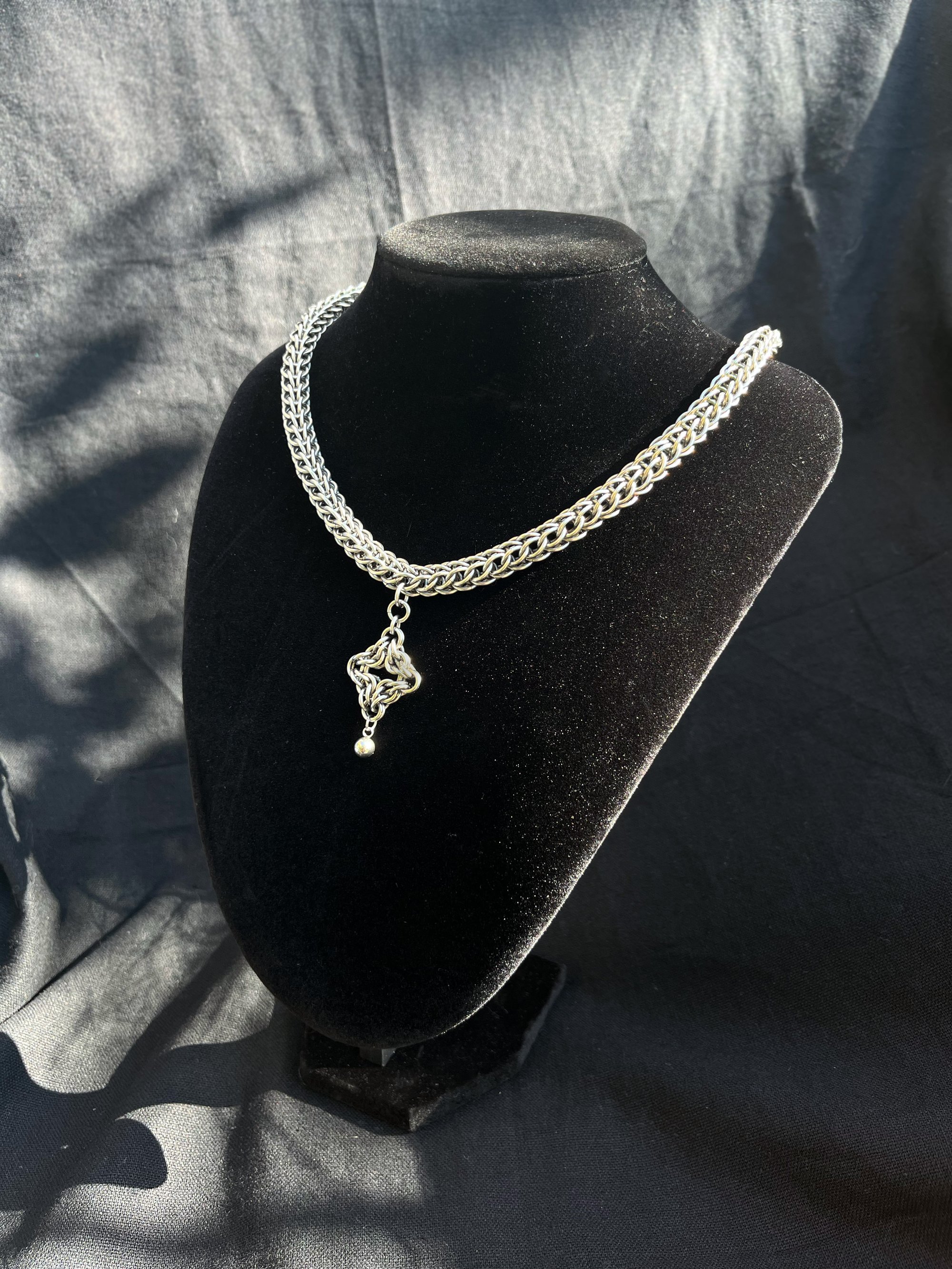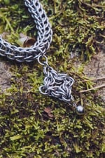 Eos is a gorgeous statement pendant, carefully handwoven in stainless steel using a combination of Byzantine Diamond and Persian 6-in-1 weaves. The smooth, dense chain pairs perfectly with a shining star ornament for a bold and eye-catching design.