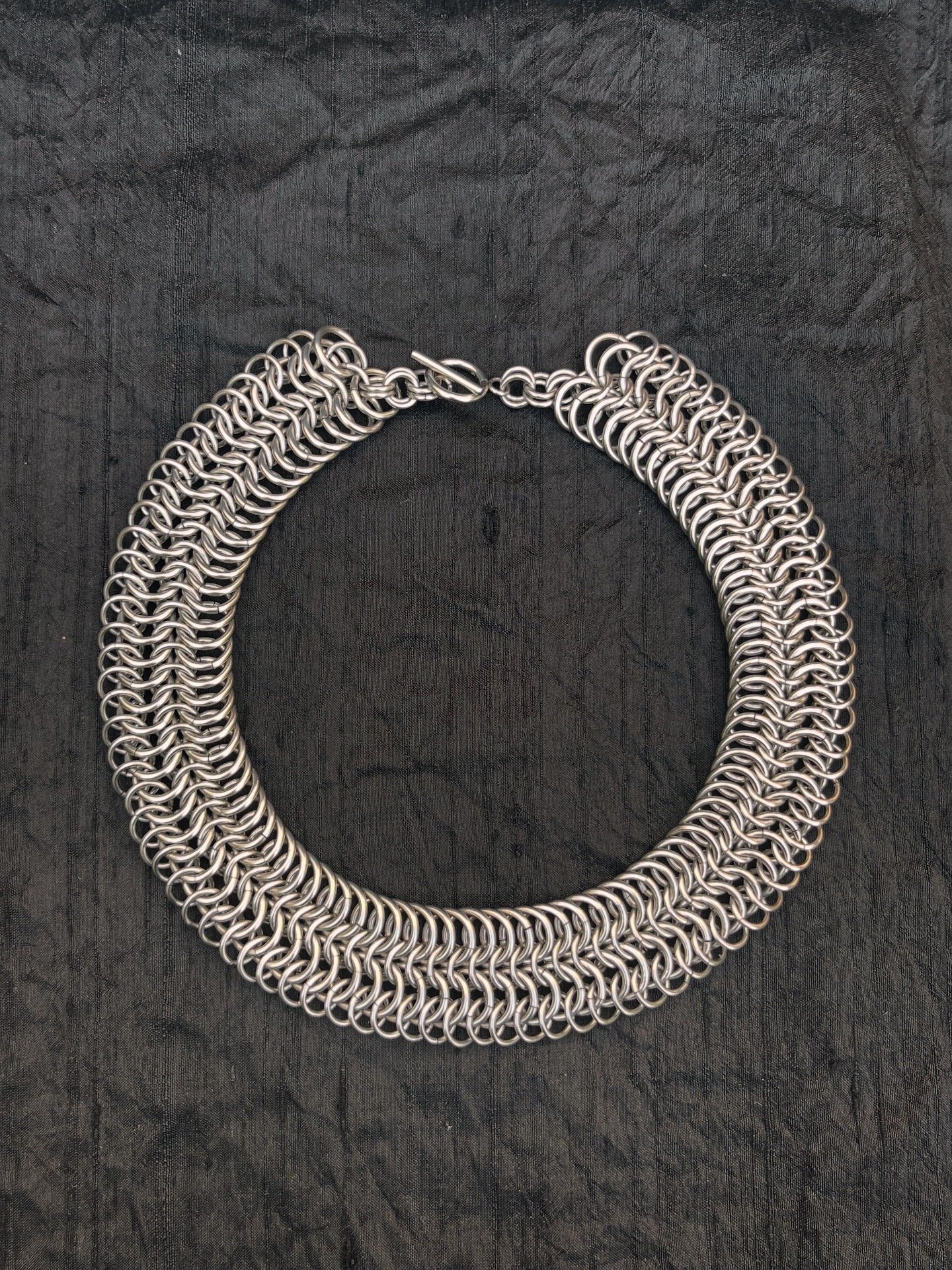This is Nirah, a dense and transformative collar, handmade in two weights of stainless steel by Rindill Makes.