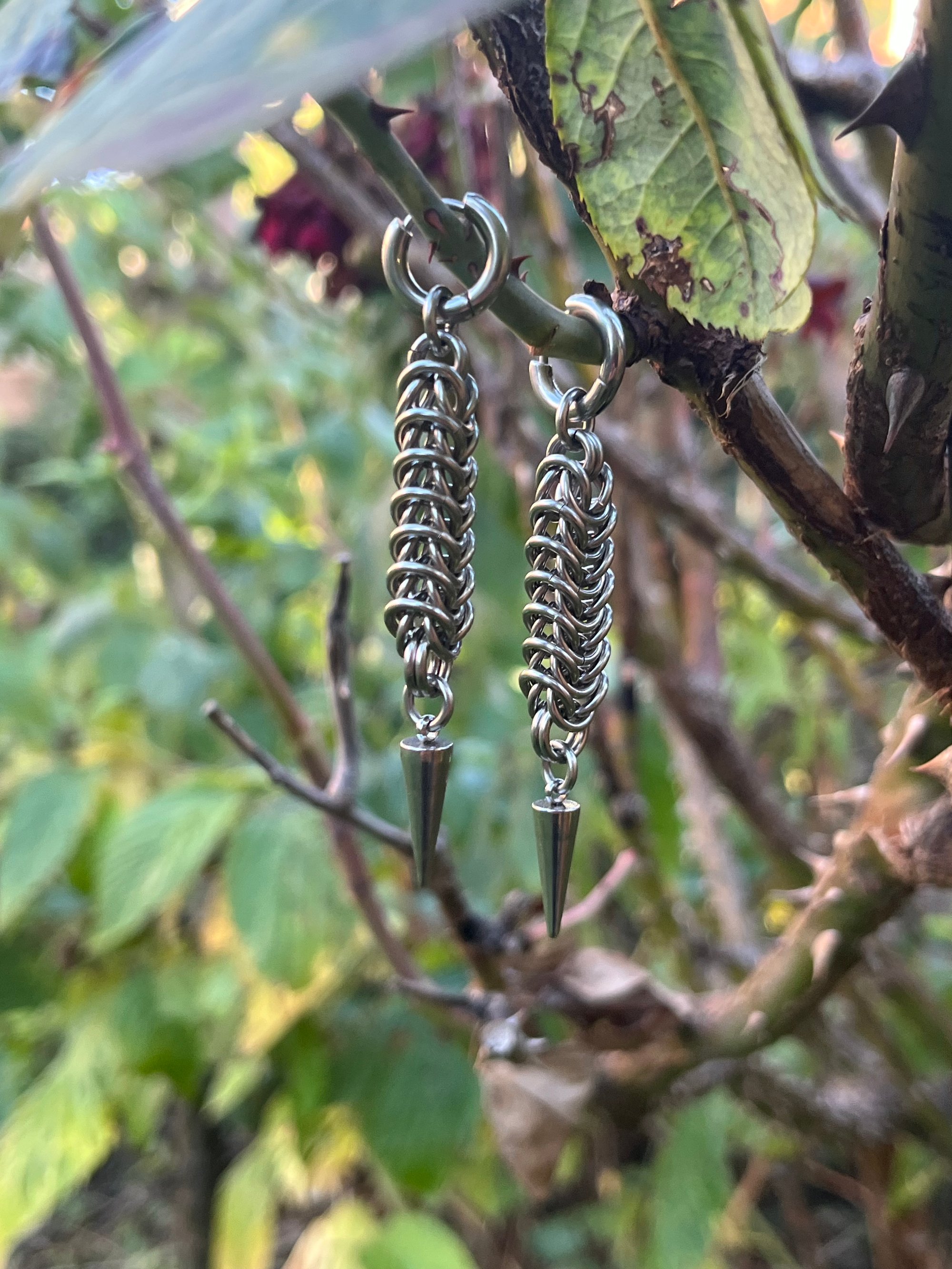 Handmade in stainless steel from a length of decorative box weave — a variation of European 4-in-1 — they're finished with stainless steel spike charms, and hung from neat huggie hoops.